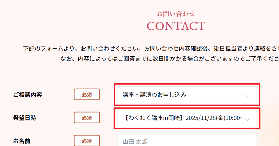 参加ご希望の方は、「お申込みフォーム」の「講座・講演のお申込み」より講座を選択して、お問い合わせください。